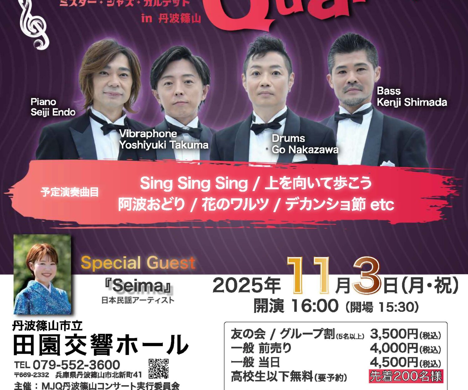 Mr.Jazz Quartet in 丹波篠山 special guest『seima』を開催致します♬   丹波篠山の音楽文化を未来へつなぐ—— 『Mr. Jazz Quartet』×『Seima』特別公演 丹波篠山地域の文化振興と音楽芸術の普及を目的に、 地域と音楽の“航路”を共有する高品質な音楽コンサートを開催いたします。 本公演では、実力派ジャズバンド『Mr. Jazz Quartet』による洗練された演奏を中心に、篠山市で活躍する日本民謡歌手『Seima』(三味線・唄)をゲストに迎え、ジャンルを超えた音楽の融合をお届けします。 目玉は、篠山の代表的な民謡『デカンショ節』のジャズアレンジ版。ジャズと日本民謡が生演奏で織りなす、迫力と美しさに満ちたコラボレーションをぜひご体感ください。本コンサートは、地域の魅力を音楽を通じて再発見し、世代や文化を超えて人々をつなぐ場となることを目指します。丹波篠山の豊かな風土と響き合う音楽のひとときを、どうぞお楽しみください。   日時 2025年11月3日(月曜日・祝日) 開演 16:00…